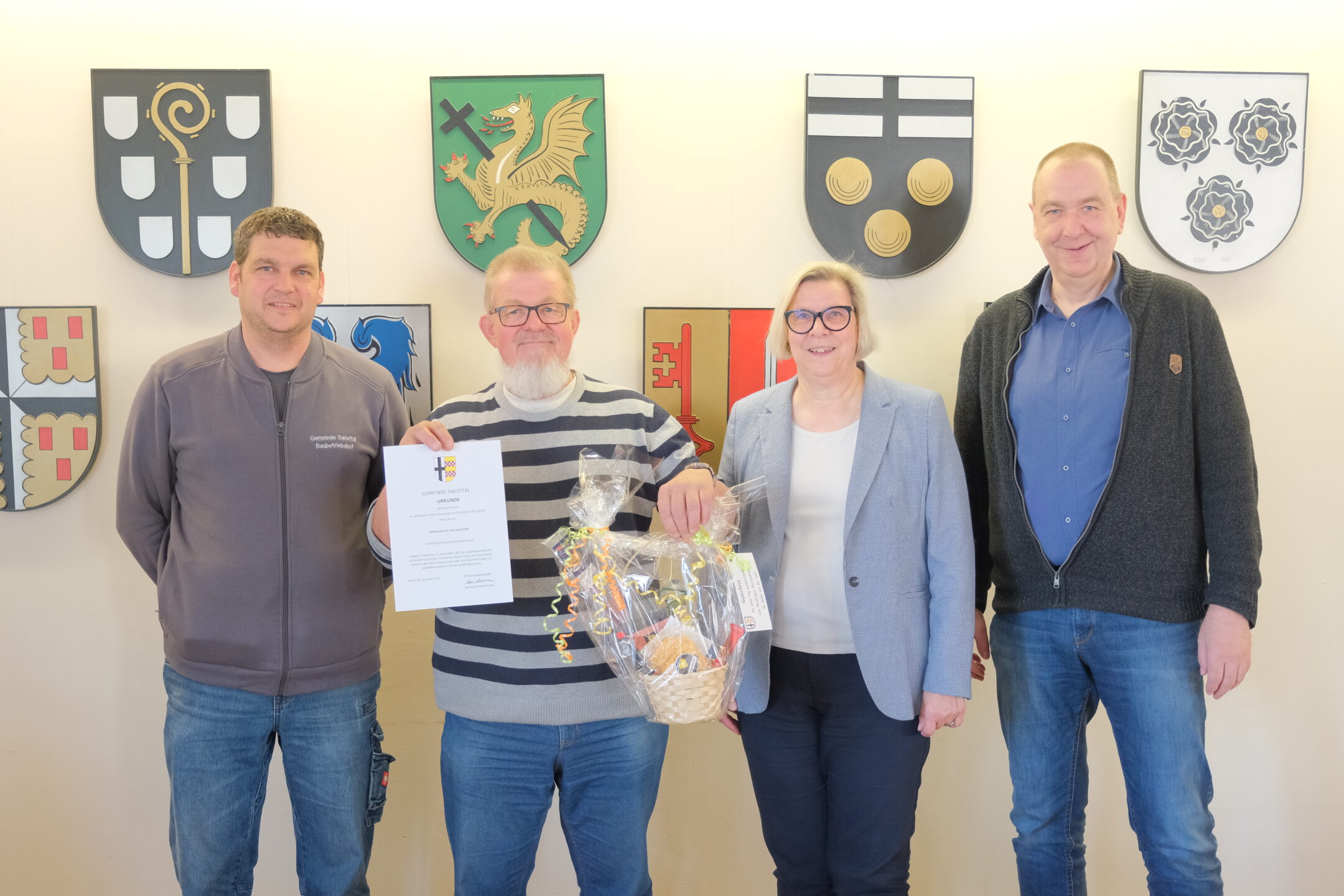 Swisttal. In diesem Jahr feiert der Bauhofmitarbeiter Detlef von der Stein sein 40-jähriges Dienstjubiläum in der Gemeinde Swisttal. Bürgermeisterin Petra Kalkbrenner, Fachbereichsleiter Jürgen Funke und stellvertretender Fachgebietsleiter Torsten Clemens gratulierten Detlef von der Stein und bedankten sich für die jahrzehntelange gute Zusammenarbeit.