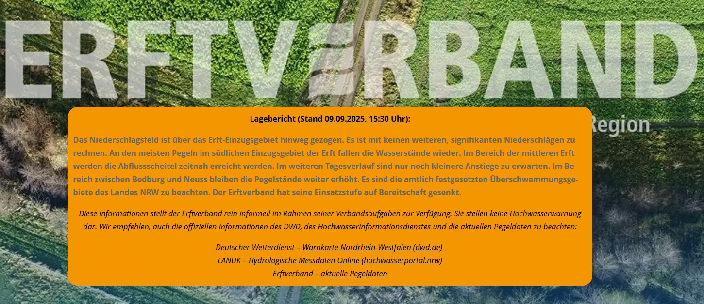 Diese Informationen stellt der Erftverband rein informell im Rahmen seiner Verbandsaufgaben zur Verfügung. Sie stellen keine Hochwasserwarnung dar. Wir empfehlen, auch die offiziellen Informationen des DWD, des Hochwasserinformationsdienstes und die aktuellen Pegeldaten zu beachten: