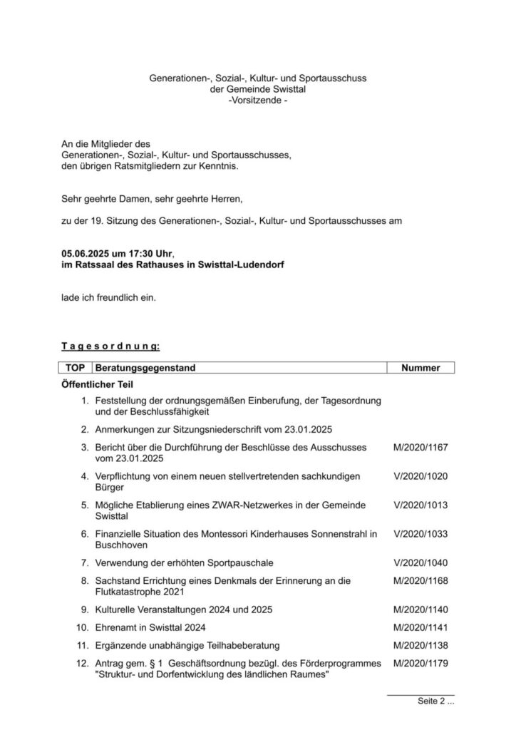 Tagesordnung - Generationen-, Sozial-, Kultur- und Sportausschuss - 05.06.2025 - 17:30 Uhr