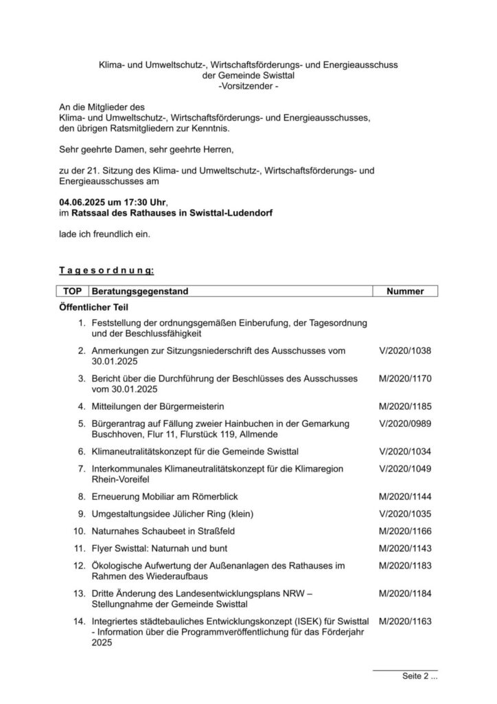 Tagesordnung - Klima- und Umweltschutz-, Wirtschaftsförderungs- und Energieausschuss - 04.06.2025 - 17:30 Uhr