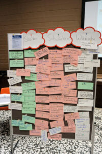 Anschließend wurden Stärken, Schwächen sowie Wünsche zu den einzelnen Rubriken benannt, auf Karten festgehalten und an die jeweiligen Stellwände geheftet. Das sich daraus ergebene Meinungsbild zu den einzelnen Themenfeldern wurde anschließend im Plenum vorgestellt und diskutiert.
