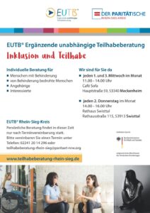 EUTB® – Beratungsangebot in Swisttal im Rathaus (Ratssaal der Gemeinde) jeden zweiten Donnerstag im Monat von 14.00 bis 16.00 Uhr.